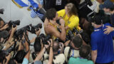 その直後、デュプランティスは観客席に駆け寄り、妻 デシレ・イングランデルさん と抱き合いキスを交わしました。
